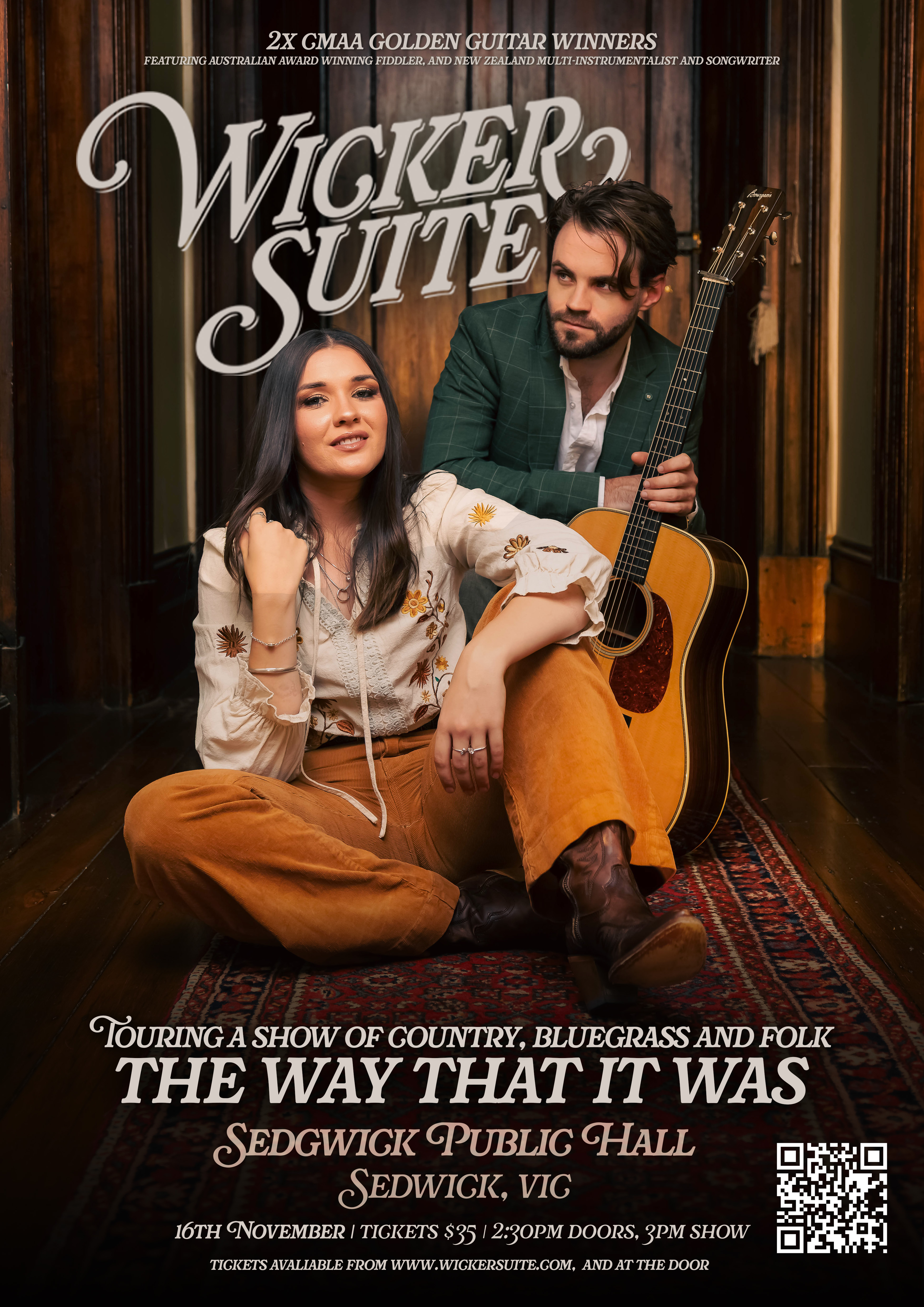 Award-winning duo Wicker Suite are hitting the road with their heartfelt and down-to-earth tour: The Way That It Was. Inspired by the classic country hall tours of Slim Dusty and Joy McKean—and following in the footsteps of modern trailblazers like Fanny Lumsden and the Festival of Small Halls—Wicker Suite is heading into the heart of rural Australia, bringing their music, stories, and warmth to the halls that once formed the lifeblood of the community.