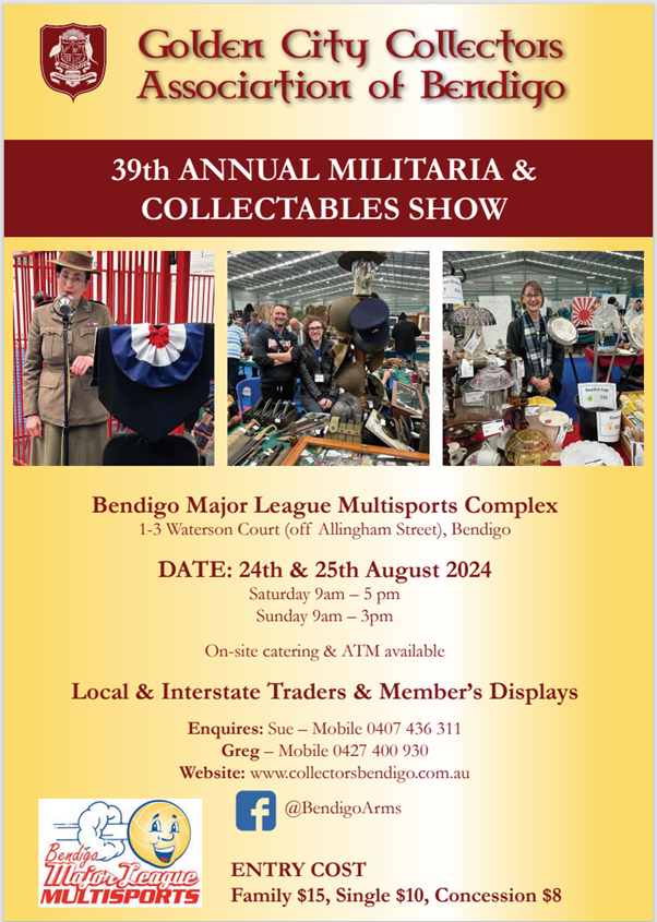 The Golden City Collectors Association of Bendigo brings you the 39th Annual Militaria & Collectables Show on the 24th and 25th of August. Held at Bendigo Major League Multisports Complex, 1-3 Waterson Court (off Allingham Street), Bendigo. Entry is $15 for a family pass and $10 for singles and $8 concession.