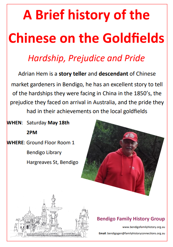 As a descendant of an early Chinese family on the Goldfields, guest speaker Adrian Hem will present a brief history of the Chinese on the Goldfields on Saturday the 18th of May. Adrian will introduce a range of equipment they used, their journey from their homeland, the activities they undertook and much more. Come along and enjoy the interesting facts and information he has accumulated at the Bendigo Goldfields Library at 2pm, Ground floor.
