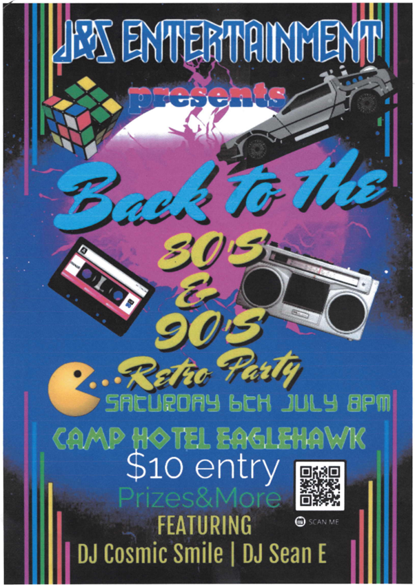 Re-live the 80’s and 90’s on Saturday the 6th of July at J&S Entertainment’s Retro Party. Kicking off from 8pm at the Camp Hotel Eaglehawk. Entry is only $10 with lucky prizes and more. Featuring DJ Cosmic Smile and DJ Sean E it’s not to be missed.