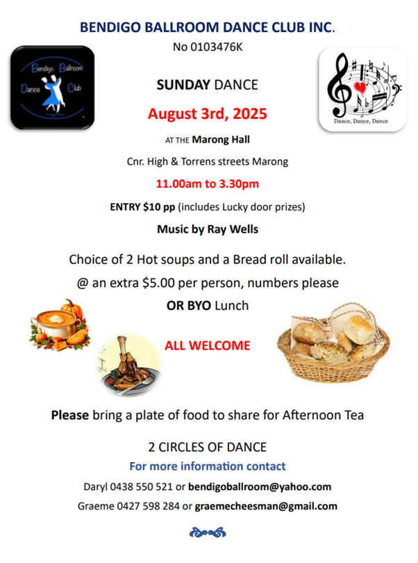 Kick up your heels at the Bendigo Ballroom Dance Clubs Dance on Sunday August 3rd from 11am to 3.30pm at the Marong Hall. Entry only $10 including lucky door prizes. BYO Lunch or purchase Soup and bread roll for only $5 per person.