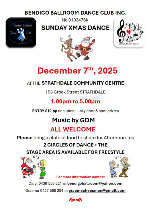 Put your dance shoes on for Bendigo Ballroom Dance Club’s Sunday XMAS Dance December 7th.