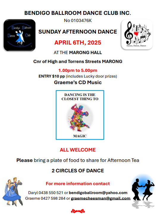 BENDIGO BALLROOM DANCE CLUB INC. invites you to join them Sunday April 6th at the Marong Hall from 1 to 5 pm for an afternoon of dance, prizes and afternoon tea.