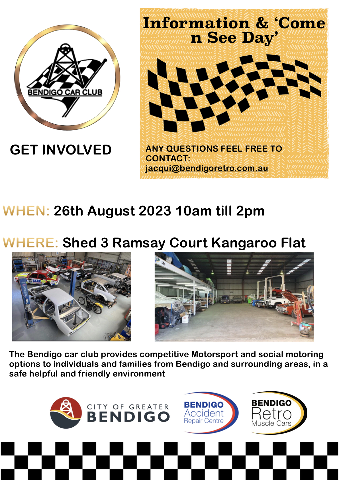 Come to Ramsay Court Kangaroo Flat & see a race car workshop & find out about getting started in grassroots Motorsport with the Bendigo Car Club.