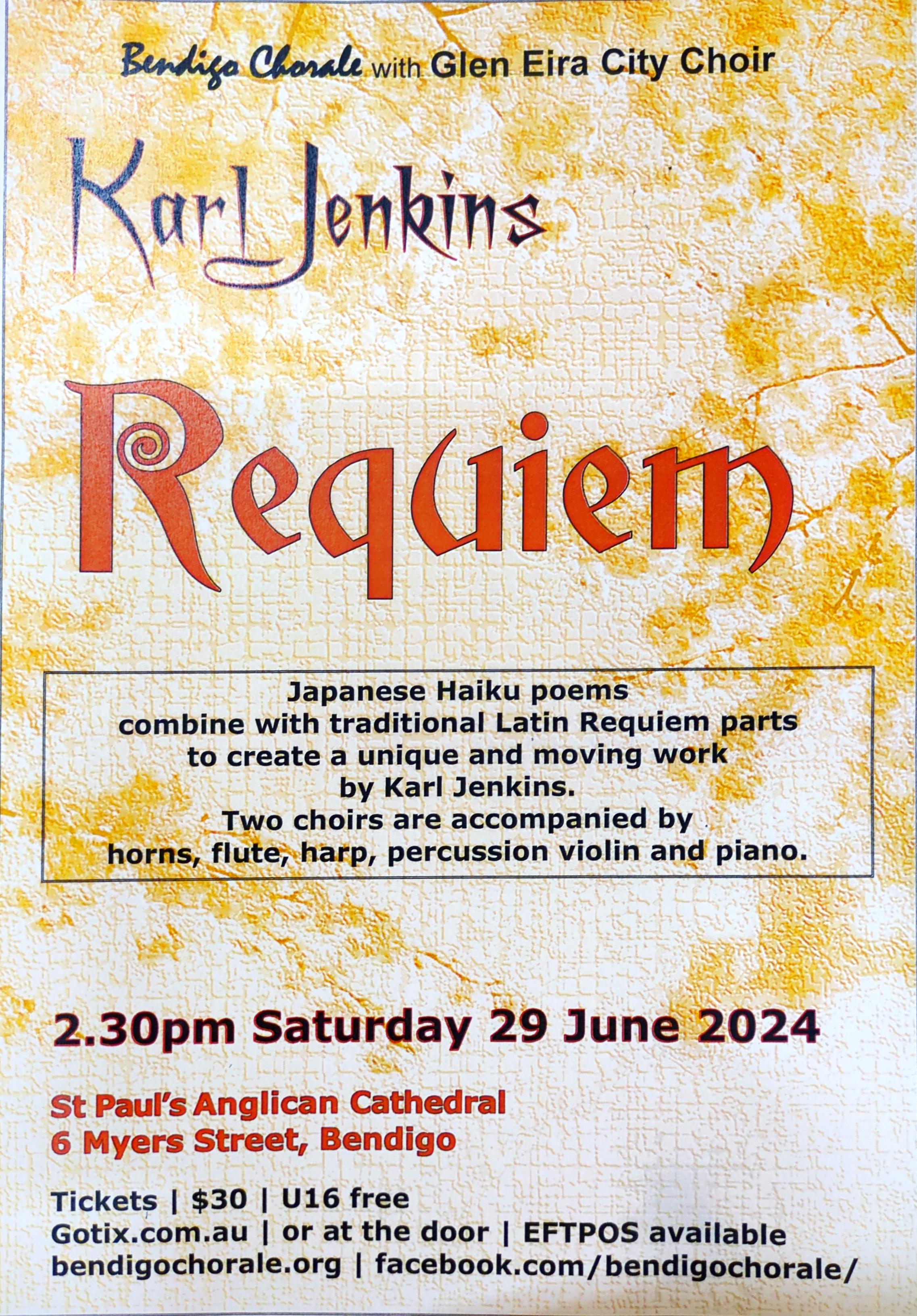 The Bendigo Chorale will combine with Glen Eira City Choir to form a chorus of 60 choristers to sing Karl Jenkins’ ‘Requiem’. To do justice to Jenkins’ magnificent work they will be accompanied by an instrumental ensemble comprising horn, flute, harp, violin, percussion and piano.