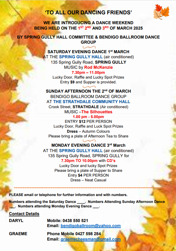 Brought to you by Spring Gully Hall Committee and Bendigo Ballroom Dance Group a fantastic dance weekend, kicking off on Saturday March 1st at 7.30pm at the Spring Gully Hall.