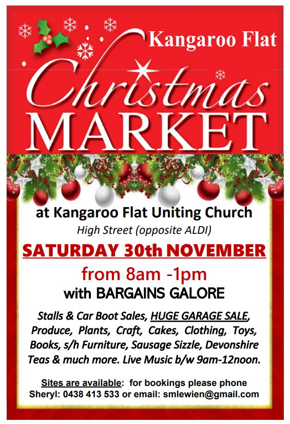 Kangaroo Flat CHRISTMAS MARKET will be held on Saturday 30th November at Kangaroo Flat Uniting Church, High Street, (opposite ALDI) from 8:00am – 1:00pm. Featuring a wide variety of Market Stalls & Car Boot Sales, plus a HUGE GARAGE SALE there will be bargains for everyone with Trash & Treasure; secondhand furniture; household items; Tools; Books; Toys; Clothing; Craft; Cakes; Jams; Produce; Plants; a Sausage Sizzle; Devonshire Teas and much more.