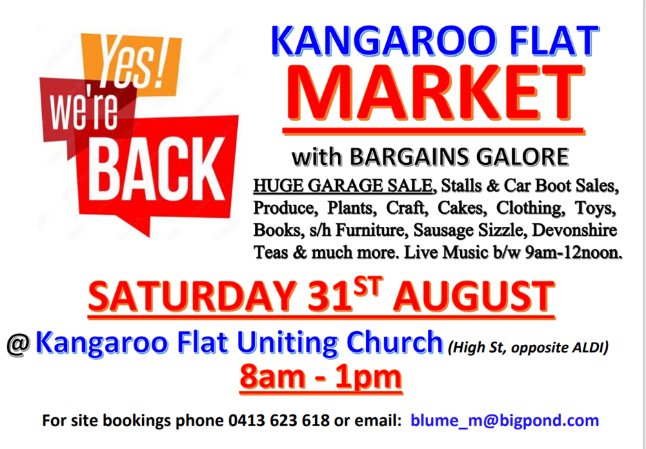 Kangaroo Flat MARKET is BACK AGAIN on Saturday 31st August at Kangaroo Flat Uniting Church, High Street, (opposite ALDI) from 8:00am – 1:00pm. Featuring a wide variety of Market Stalls & Car Boot Sales, plus a HUGE GARAGE SALE there will be bargains for everyone.