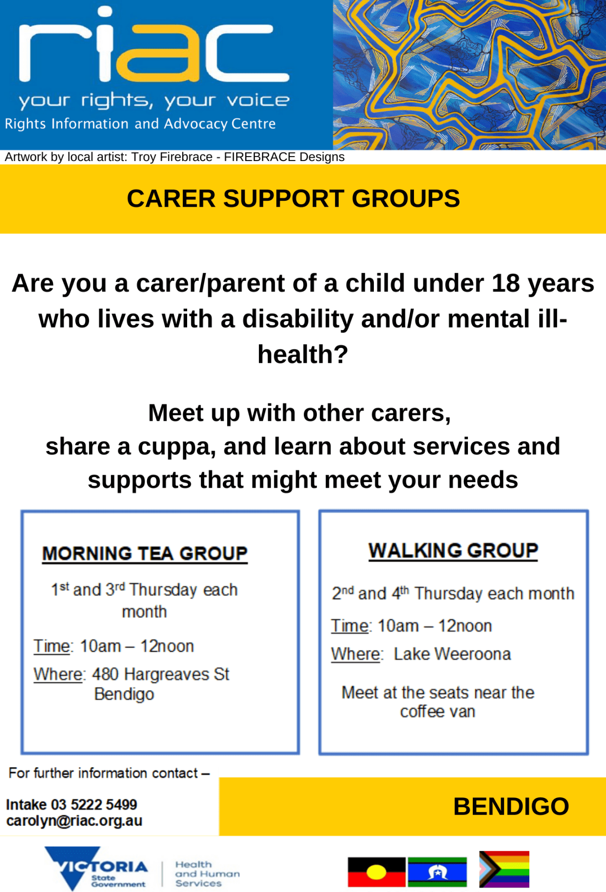 Bendigo Rights Information and Advocacy Centre is offering a great chance to get to know other carers, share stories and ideas on the 3rd Thursday of each month from 10:00am until 12:00pm.