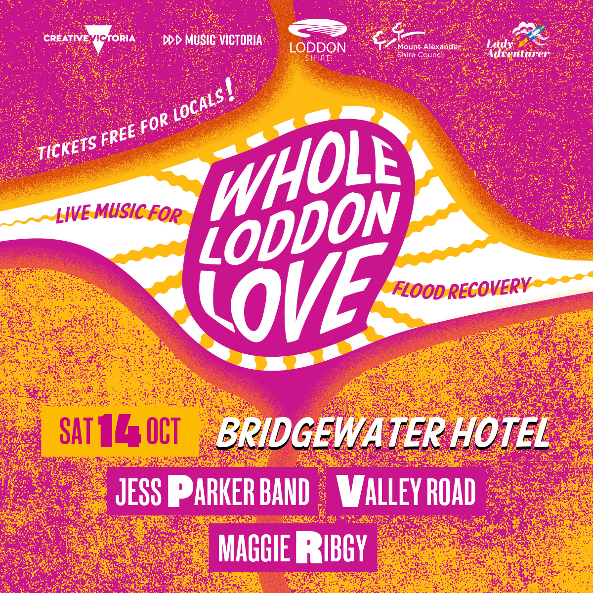 Whole Loddon Love is bringing live music back to pubs and halls in flood-affected areas along the Loddon River this October – and we’re excited to be celebrating our second weekend of events, with Saturday night in Bridgewater, at the Bridgewater Hotel – featuring live music from The Jess Parker Band (Campbells Creek/Naarm) and Valley Road (Central Victoria), plus Maggie Rigby (The Maes). The good folks at Shedshaker Brewing have donated a “Keg for Good”.