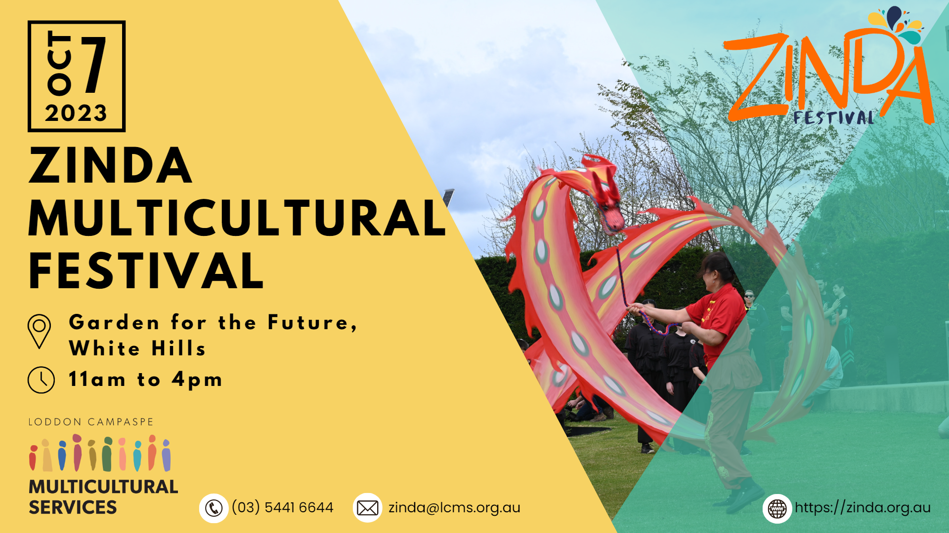 Zinda Multicultural Festival is Bendigo’s multicultural festival (presented by Loddon Campaspe Multicultural Services) that celebrates music, dance, food and cultures that contribute to the vibrancy of regional Victoria. Zinda Festival will be held on 7 October 2023 from 11am to 4pm at the Garden for the Future in White Hills.