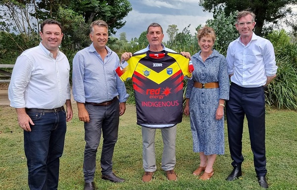New South Wales Premier, Dominic Perrottet, Minister for Tourism and Sport, Stuart Ayres, Andrew Constance and Fiona Kotvojs were in Bega yesterday where they presented the Chairman of Group 16 Rugby League on the South Coast, Allan Wilton, with a grant for the annual Indigenous All Stars game.